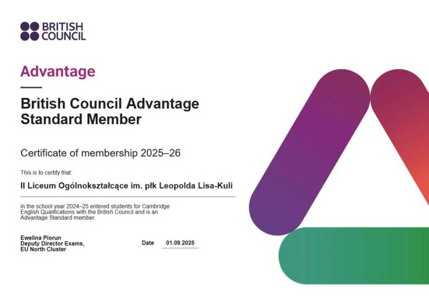 Z przyjemnością przypominamy, że II LO współpracuje z British Council i w bieżącym roku szkolnym bierze udział w Programie Advantage Standard 2025/2026. W wyniku tej współpracy można poprzez II LO zapisywać się na egzaminy Cambridge, potwierdzające znajomość języka angielskiego.