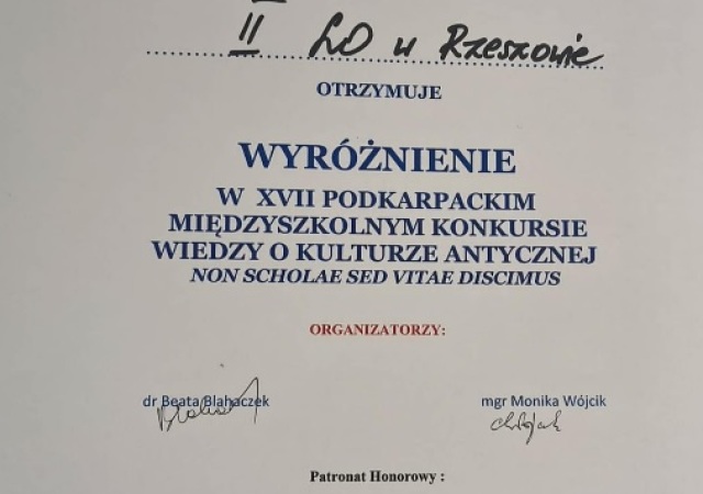 W środę 4 marca nasza drużyna w składzie: Julka Magdziak z 1a, Julka Pastuła z 1i oraz Mikołaj Socha z 1a walczyła na Uniwersytecie Rzeszowskim w Finale Podkarpackiego Konkursu Wiedzy o Kulturze Antycznej. Ten popularny wśród naszych uczniów konkurs, organizowany tym razem już po raz siedemnasty przez VILO i Instytut Historii UR, wymaga nie tylko wiedzy, ale też talentu scenicznego. Drużyna przedstawiła antyczną scenkę rodzajową według napisanego przez siebie scenariusza i odpowiadała na pytania komisji z zakresu kultury antycznej.