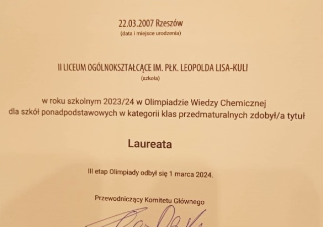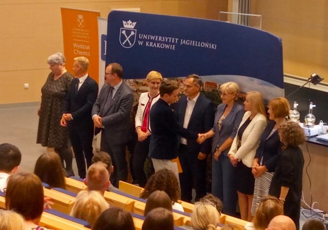W piątek 24.05.2024 r. odbyło się uroczyste wręczenie nagród dla Laureatów Ogólnopolskiej Olimpiady Wiedzy Chemicznej dla uczniów szkół ponadpodstawowych organizowanej przez Wydział Chemii UJ w Krakowie. Miło nam poinformować, że laureatem został uczeń naszej szkoły Nikodem Onyszczuk z klasy II g.