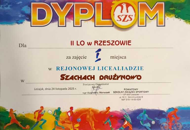Z dumą informujemy, że w dniu 24.11.2025 r. reprezentacja Szachistów z Naszej Szkoły zajęła pierwsze miejsce w Finale Rejonowym Szachów Drużynowych w Leżajsku i tym samym awansowała do Finału Wojewódzkiego !!!