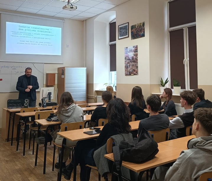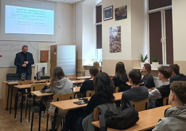 W ramach patronatu Instytutu Filologii Klasycznej Uniwersytetu Jagiellonskiego nad klasami humanistycznymi naszego liceum gościliśmy w minionym tygodniu wicedyrektora tegoż Instytutu, dr. Janusza Rybę. Nasz gość, wykładowca UJ, jest metodykiem i praktykującym dydaktykiem, również nauczycielem języka łacińskiego w krakowskim ,,Nowodworku". Co ważne, jest autorem podręcznika, z którego korzystamy, a ponadto od lat angażuje się w prace CKE, mając wpływ na zakres i formę egzaminów maturalnych.
