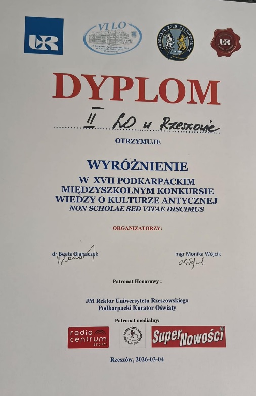W środę 4 marca nasza drużyna w składzie: Julka Magdziak z 1a, Julka Pastuła z 1i oraz Mikołaj Socha z 1a walczyła na Uniwersytecie Rzeszowskim w Finale Podkarpackiego Konkursu Wiedzy o Kulturze Antycznej. Ten popularny wśród naszych uczniów konkurs, organizowany tym razem już po raz siedemnasty przez VILO i Instytut Historii UR, wymaga nie tylko wiedzy, ale też talentu scenicznego. Drużyna przedstawiła antyczną scenkę rodzajową według napisanego przez siebie scenariusza i odpowiadała na pytania komisji z zakresu kultury antycznej.
