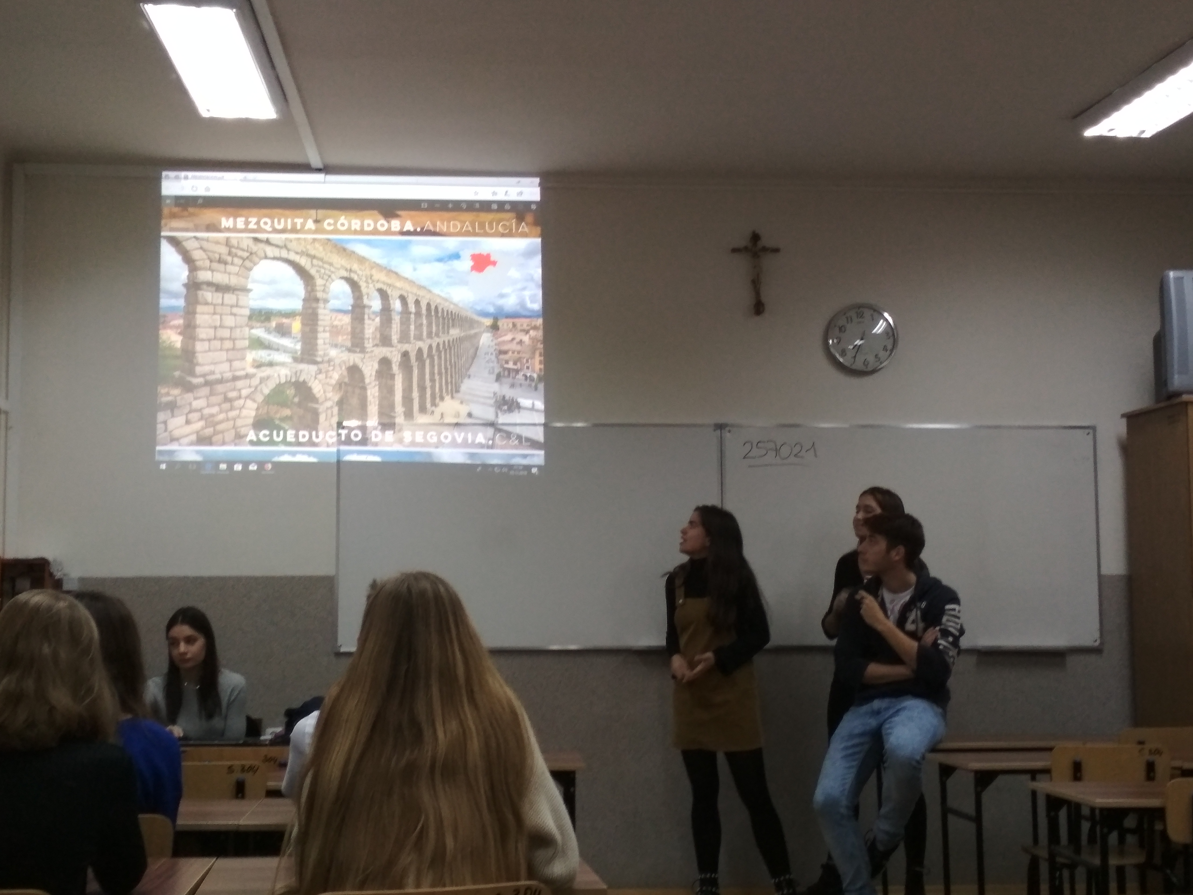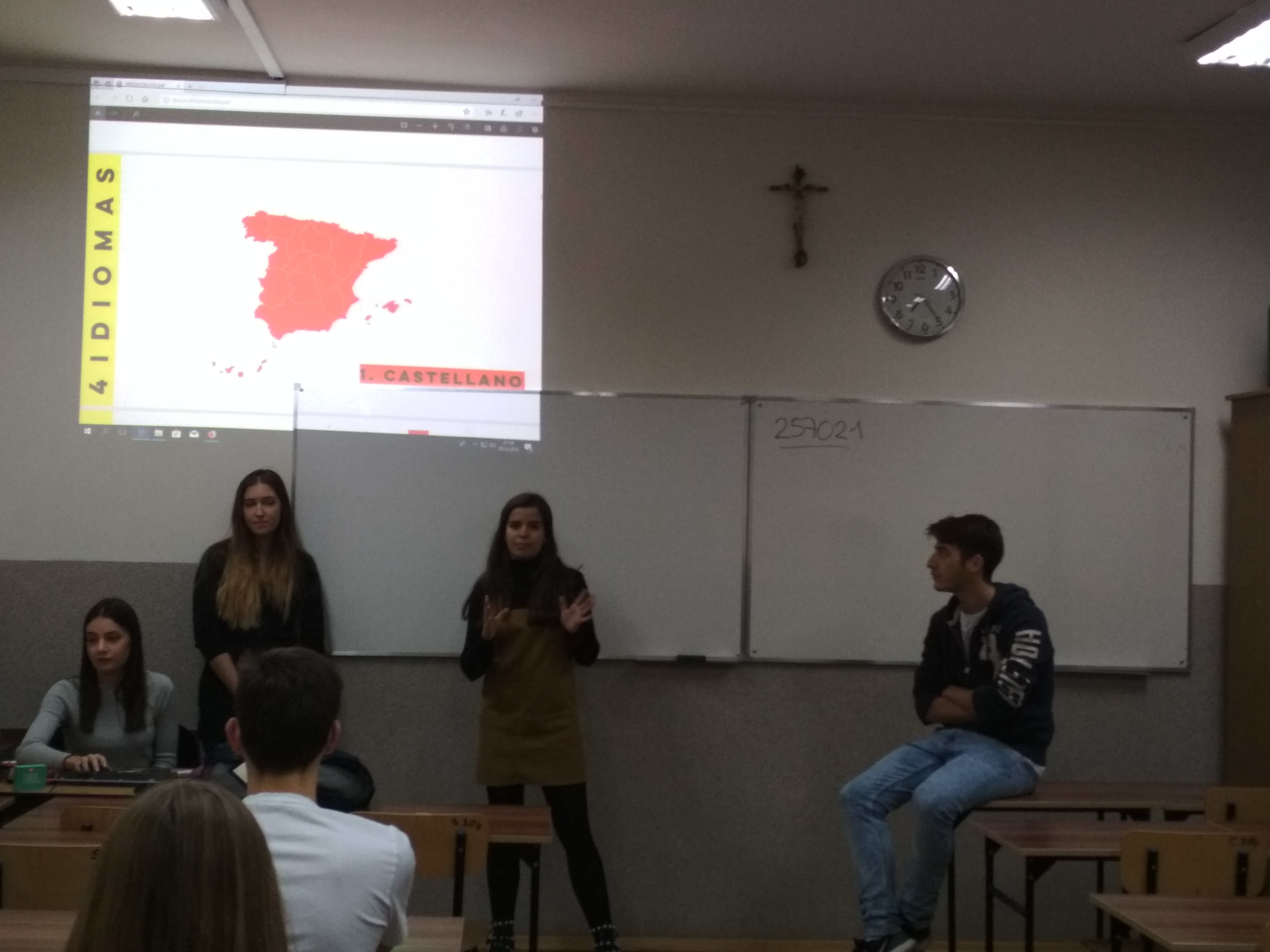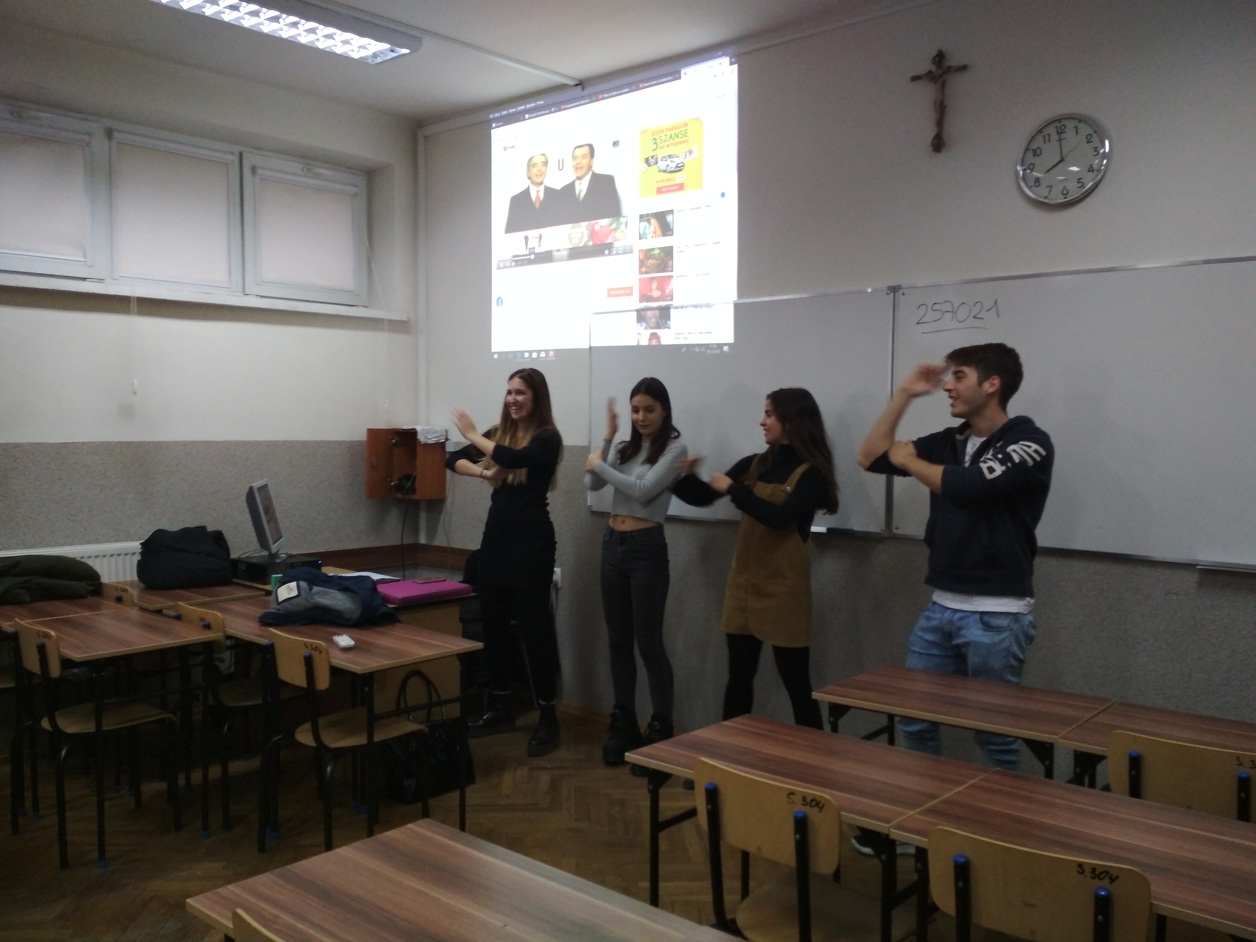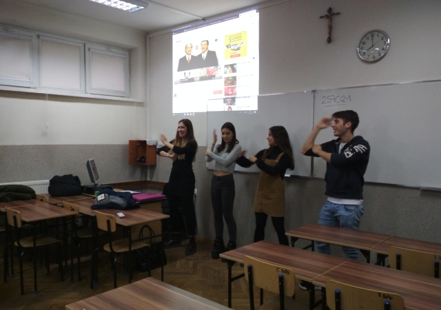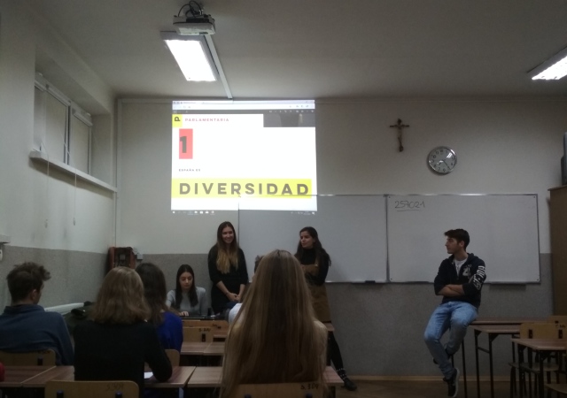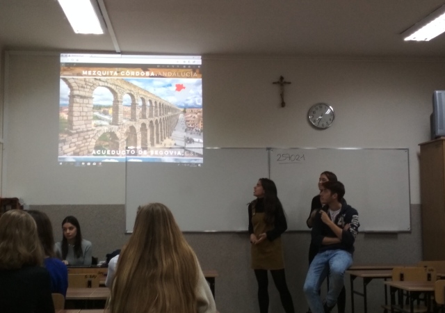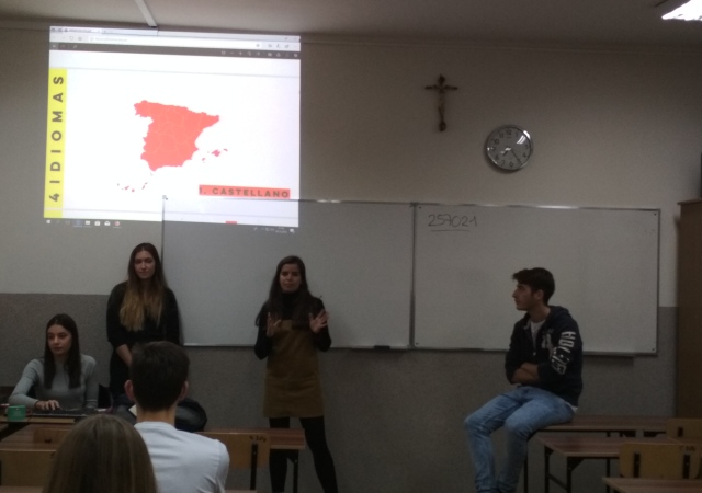 5 grudnia 2018 mieliśmy przyjemność gościć w naszej szkole czworo studentów z Hiszpanii, którzy przebywają obecnie w Rzeszowie na stypendium Erasmus. Nasi goście przybliżyli nam kulturę Hiszpanii, opowiedzieli o słynnych fiestas oraz przeprowadzili atrakcyjne quizy. Uczniowie klas drugich wzięli udział w lekcjach prowadzonych wyłącznie w języku hiszpańskim. Była to dla nich świetna okazja do sprawdzenia swoich umiejętności językowych jak i poszerzenia wiedzy na temat Hiszpanii. Nie zabrakło dobrej zabawy oraz… tańców ![]()
