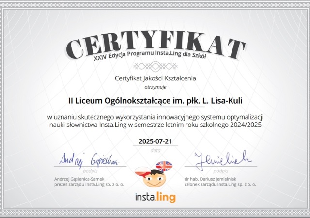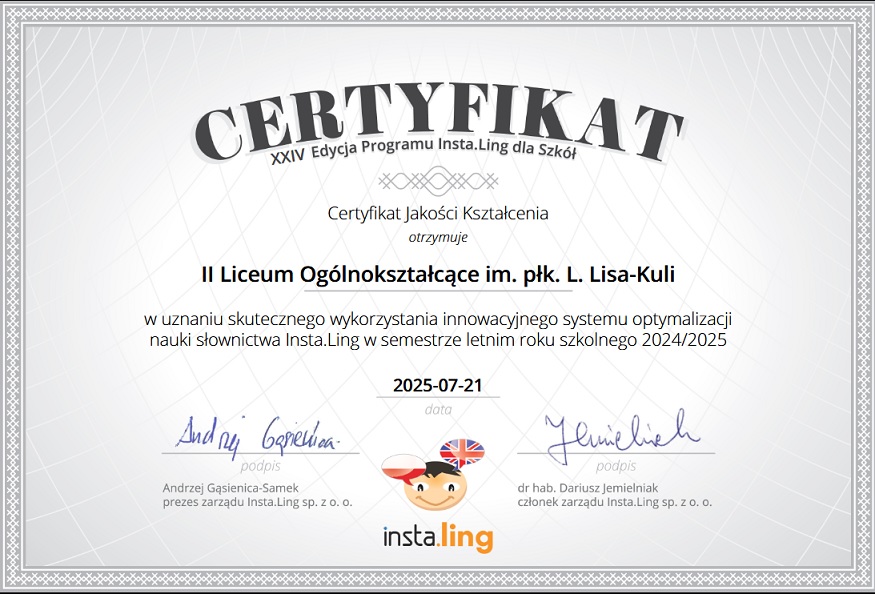 Z przyjemnością informujemy, że II Liceum bierze udział w XXV Edycji Programu InstaLing dla Szkół w semestrze zimowym. InstaLing jest aplikacją dostępną pod adresem www. instaling.pl, która umożliwia uczniom szybką naukę słówek, a nauczycielom wgląd w szczegółowe raporty o systematyczności ich pracy oraz dostęp do narzędzi do oceny wyników. Przypominamy, że w poprzedniej edycji szkoła uzyskała Certyfikat Jakości Kształcenia w uznaniu skutecznego wykorzystania systemu nauki słownictwa.