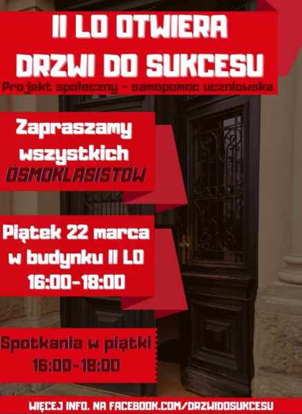 Miło nam poinformować, że z entuzjazmem przystępujemy do kolejnej edycji projektu,, II LO Otwiera Drzwi Do Sukcesu ". Jest to projekt społeczny, realizowany przez uczniów naszej szkoły dla młodszych kolegów, potrzebujący doraźnej pomocy w nauce. Od piątku 22 marca w kolejne kwietniowe piątki (z wyłączeniem Wielkiego Piątku) grupa wolontariuszy - korepetytorów z naszego liceum będzie w gotowości oczekiwać na ósmoklasistów, aby służyć im pomocą w nauce. Oferujemy wsparcie w zakresie wszystkich szkolnych przedmiotów. Nasi wolontariusze będą dostępni w piątek od 16.00 do 18.00 na terenie szkoły. Projekt zakończy się w maju galą finałową, połączona z rozdaniem nagród dla najlepszych korepetytorów i najbardziej gorliwych uczniów.